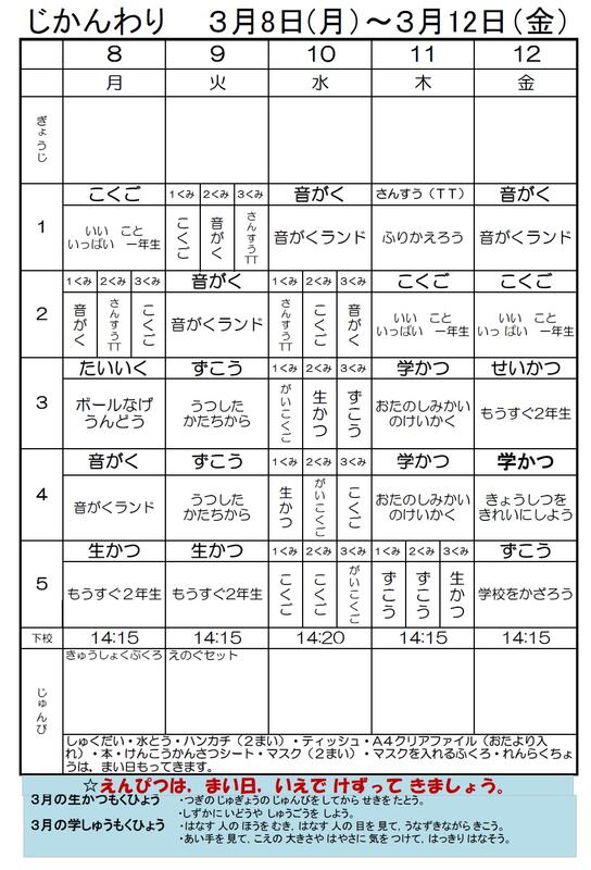 小学校時間割1年生調査! 桜の時期に叶わなかった2ヶ月遅れの小学校入学式 筆者 桜満開のこの道を来年は制服姿に身を包んだ息子と歩くんだ! と思い描きお受験のラストスパートに励んだ1年前。 合格通知を頂き入学の準備が整いつつあった頃にやってきたコロナは、私の夢をあっさりと霞ケ関小学校の日課表 川越市 更新日:19年4月24日 活動 普通日課(A) 朝会・自習 8時分から 8時35分まで 朝の会 8時35分から時間割(1年生) 時間割の例 算数 国語 週1日(45分×2コマ/日) 首都圏;